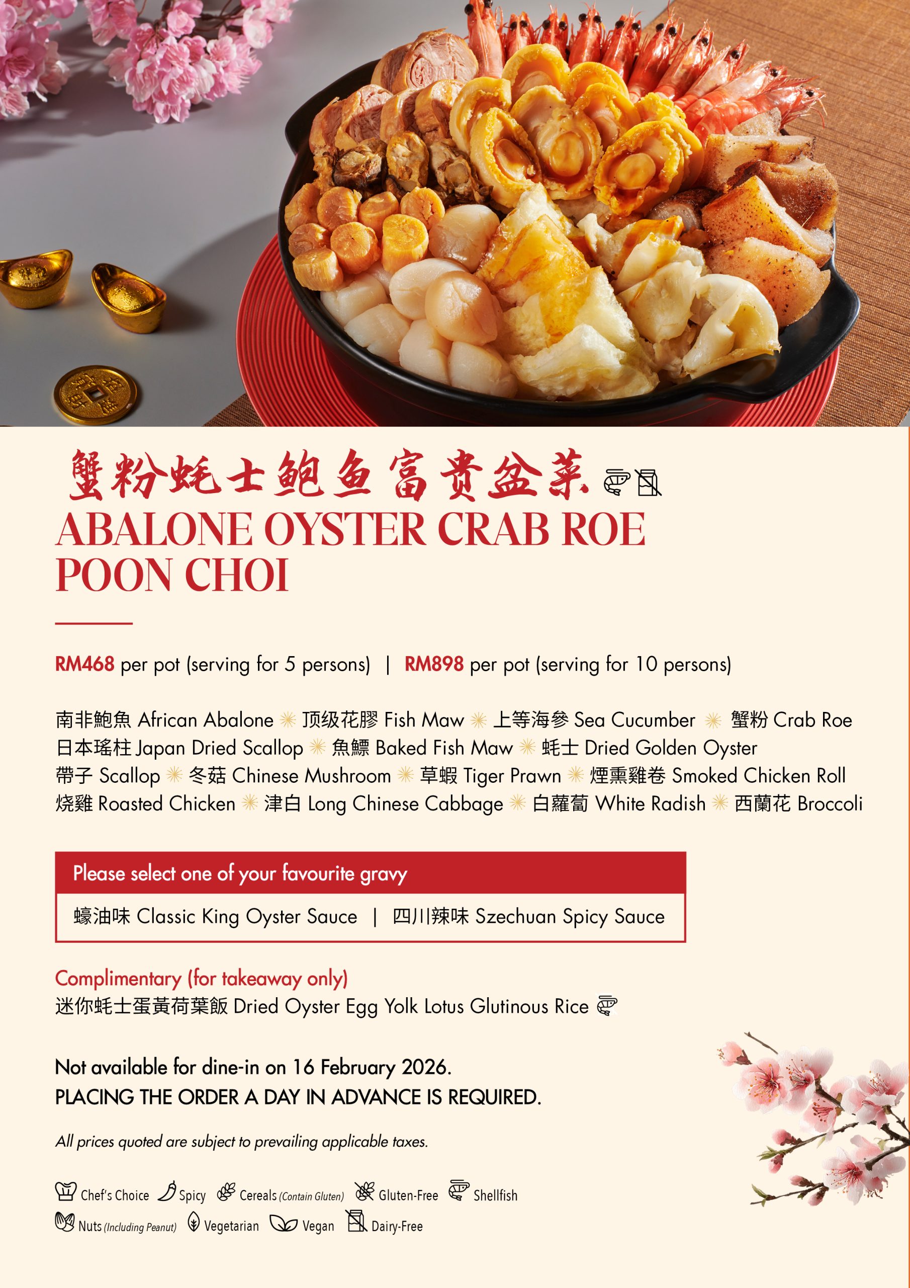 A tradition of abundance. Indulge in a bountiful abalone bowl, Poon Choi, a deeply symbolic dish for Cantonese and Hakka families – with many layers of seafood, meats and vegetables, signifying prosperity and togetherness.
